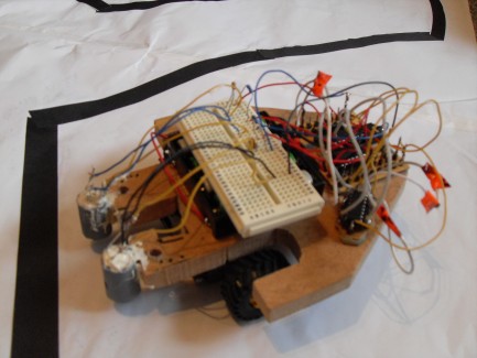 Hey guys i finally got around to finishing my first robot. Thanks everyone at LMR it would still be in hundreds of pieces without the help from you guys! Simply: it follows a black line. it looks like a bunch of wires and a few chips bluetacked onto a piece of wood but apart from the looks i think it works pretty well. i hope you guys like it, any tips or modifications would be appreciated.