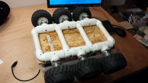 Here's my partial build of my six-wheeled GardenerBot. Ideally it will at least drive around the yard successfully! :D Based on the Wild Thumper design idea. Using a Sabertooth 2x5 motor controller and a 12V 5Ah battery. Using an Arduino to provide PWM signals to the Sabertooth.