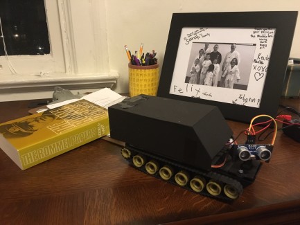 I used a small breadboard to create a power system for the GDR. 7.4V comes in from the LIPO battery in the chassis, and the board puts out 7.4V for the motors, and a strip of 5V pins for all my components (also integrating a pair of capacitors to hopefully stabilize power flow (especially for the use of the ultrasonic sensor). The power board works great as far as I can see so far, but the prototyping board I used is a little big to fit comfortably on the deck of my chassis (it's on the desk beside the GDR in the photo). before field testing I may use the dremel cutter and take down the size of the board to just the sections I am using.