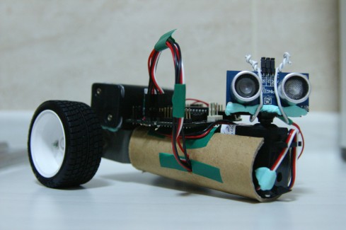 Anyways, back to the bot: It does not do much now since i haven't mounted my 180 servo yet, the one you see in the pictures is just a continuous one i have used to give myself and you an idea of how it is gonna be. It goes aroung with its ultrasonic sensor avoiding objects it finds on its way.