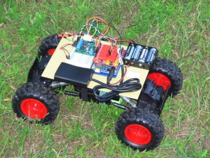 ~UPDATE: Well, I was going to post a video but than I realized that the steering system broke. My guess is that a cheap R/C car has a hard time handling the forces of sudden turns that the motor controller is capable of providing. When I turn, the gears that turn the wheels slip, causing a very annoying grinding sound and preventing the wheels from fully turning. So a note and a word of caution, if you use cheap parts don't overexert them more than they are meant to. The easiest solution is to program some kind of safety into the code until you determine how much stress the vehicle can withstand.