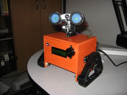On the front a LCD displays messages and a bargraph of the Battery voltage level. There is also a super bright blue Led which lights up when he detects an obstacle so he can have a closer look. A piezo on the front to make some warning beeps.