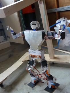 heres the fully asembled robot also I made a little helmet for the robot . The wooden structure in the backround is for helping the robot learn to walk which make programing it a bit easyer if the robot is upright.