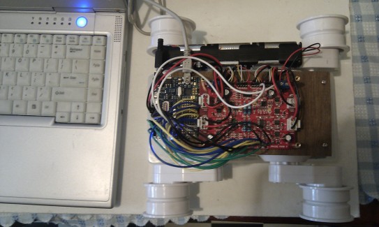I have earlier made a little progress on measuring the performance of the various motors by reading the quadrature information and using that to power the motors differently based on their calibration. I have taken readings for all four motors at pwm = 40. Tonight I did some readings of motors 1 and 2 at pwm = 200. I switched over the interrupts to read motors 3 and 4 and that's when the problems started. Because I had too much time on my hands I had screwed down the top mounting plate. This made the interrupt pins inaccessible (d'oh!) So I undid and pulled off the top mounting plate, switched the interrupts then started it up.