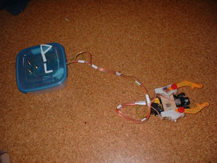 Hi everyone. I have just started in let's make robots and I wanted to show you my first project. I hope you like it . So first what I did is went to the part search. It was easy becose I needed only 3 switches 2 gearboxes 4 motors 1 AA batery holder and some wires. After I've done my shoping I went to my room and grabed the schematics of this robot. Then I went to my workshop wich was my backyard garage and started searching for the base of my car. I found an old toy car lying arownd and it became my cars base. the remote became an old luncbox. Then I started making the base for my two big white gearboxes. The base for the gearboxes was an old peace of wood. I mounted the gearboxes on the wood and mounted the wood to the car. Then I drilled a hole in my lunch box for the wiers to come out and drilled three more holes on the lunchbox for the swiches. Then I solder the swiches to the wires and solder the wires to the 4 motors. Then I mownted those plastic orange toy parts to the gearboxses my sister sticked a sticker on one of gearboxes and we went out on a test run. We tested if this car cuold pull and push my cats eating bowl. It cuold move my cat's bowl so it was working. And thats this robot's story. Thank yuo all again for waching.