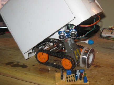 I plan on changing the voltage regulator to a DC/DC converter and maybe going with a Tamiya gearbox/tread setup in the future.