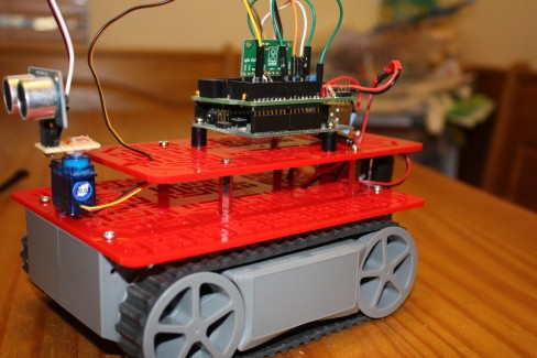This is my second bot. This one uses a RP5 tracked chassis that I bought from Pololu. It also uses Pololu's Qik2s9v1 serial motor controller. Currently the only sensor is a Parallax Ping attached to a servo for scanning. I plan on adding some Sharp IR's for close in detection and an optional line-following kit.