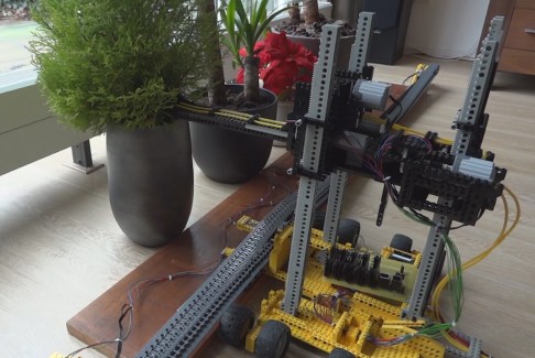 This robot waters the plants while you're on holiday! You have to line up the plants and through a GUI in Microsoft Access you can input the water demands per plant (how many times per week the plant needs water and how much). The water reservoir contains a mixer and an aeration unit (through lego compressors) to avoid dead water. The only thing not lego about it is the water pump and the robot is controlled by an Arduino Duemilanove. I've used a selfmade multipurpose motor driver pcb so all the electronics visisble aren't used ;)