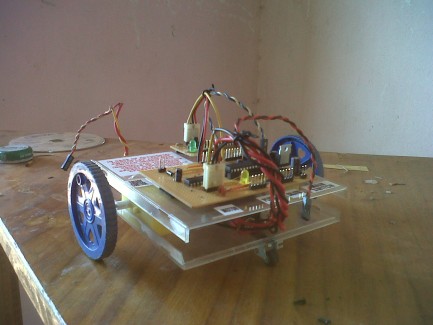 The first version of this bot had a breadboard on top with connections made by tons of wires running around. This was a good setup at first, but after a while I came to realize that a bot based on a breadboard isn't a good idea for two reasons :