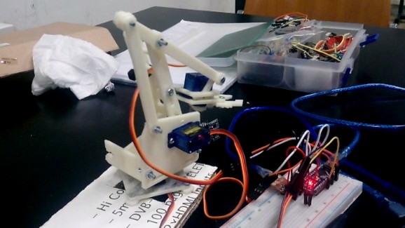 The video shows an almost complete, yet functional build of the meArm, with three motors instead of four.