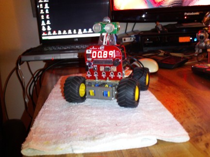 The meter it carries is a real multimeter. It’s a Sparkfun kit I picked up from NKC Electronics. After assembling it and deciding it was functional but not necessarily handy, I decided to make it into a robot. So I guess you could say that I hacked this meter into a robot, or you could say I built a robot and hacked it to carry a meter. Personally, I think the hacked meter sounds cooler, but suit yourself.