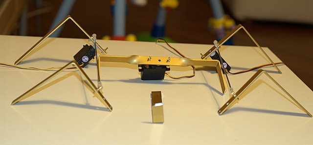 This walker robot is a compromise in design, but allows to build a sixlegged walker using just three servomotors.