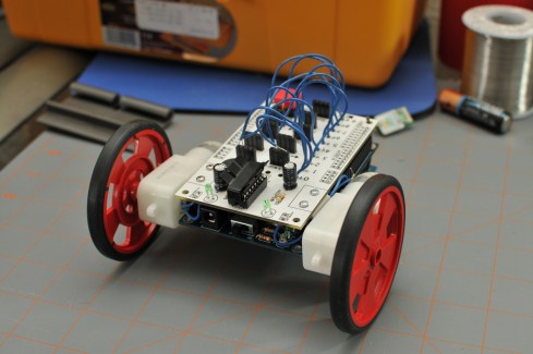 There's a Battery Platform module on bottom - this powers the motors and logic. I added jumpers to Ms. Princess just in case I needed to split the power supply, but it runs fine with a shared battery. In the middle is a Propeller Platform and the miss Princess 'interface' pcb is on top.