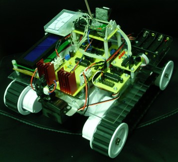 The development platform is a Dagu Rover 5 tracked platform, which has 4 motors and 4 wheel encoders. The torque developed by the motors is enormous, the tracks are very grippy and the quadrature encoders offer 333 steps / revolution. It has some flaws, such as the fact that the current limiting of the IR LEDs of the wheel encoders is too low and the 1K resistor had to be replaced with a 500ohm resistor (or by 2 parallel 1K resistors) in order for the encoders to work properly. Another flaw would be the fact that the tracks occasionally come off when the platform rotates around its axis on a rough surface. All in all, it's a very good platform for its value.