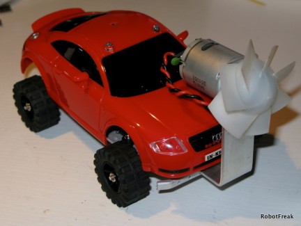 This is my competitor for the LMR DAGU contest. It is named Mr. "Red" Adair, named after the well known firefighter Paul "Red" Adair. An Atmel ATmega328 controller acts as brain together with a Pololu LVDSMC as motor controller. For the blower motor (robbed from a defect hair dryer) a simple logic level N-FET (IRL540N) has been used. The chassis is from a cheap RC car illumninated with red, white and blue LEDs. As power supply 3 AA cells for the drive motors are used. A 9V battery block has been used for the blower motor and the 5V regulated controller supply.
