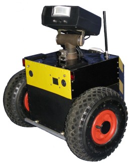 I work of this project one year, he have 4 step PWM controled by UltraSonic Radar, IR sensor, mechanical bumper (if IR sensor not see barrier) and cell phone alarm system with piroelectrical sensor (in head), also have two camera - first is BW camera with IR leds (for night mode) and second camera - RGB in head. Operator choice who camera now transmit live video on remote base station, also he take robot to remote control. This robot on board have three uC - ATMega 8 this uC controlled all system on robot.