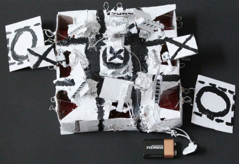 The robot works at a completely minimalistic level, with no microcontroller, transistors, ect. The fan always spins when the battery is connected, and the flipper is attached to +9v through the thin solder wire above the board. The "O" marker is just cardboard and solder that connects the ground wire to the tin foil on the board. When the wire on the spinner hits the tinfoil, the flipper is connected to ground and spins. I set it up so that it will flip over the marker next to the sensor. Super simple logic! Always moves into the center square first and always makes a win/tie.