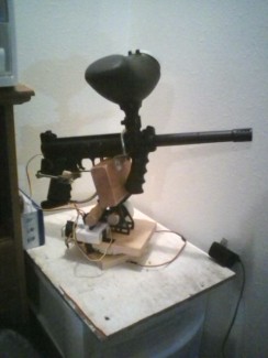 This robot is done with mechanics mostly but i still need to paint it. Thank you for looking at this robot! I started out looking at the military channel for ideas and after not finding one that matched my needs exactly I made myself a turret. I have lots of pictures so have fun and feel free to comment! It took around 12 hours to build. The wieght is 7.5 lbs approximatly. For a paintball gun it is semi automatic. 1 shot per second or two seconds Im guessing. More specs on pics. If you want to know anything else just say so thanks. It has been a joy to build. The key to building this was be optimistic on everything! Test your stuff to the limit haha! (hopefully it will keep on working for a loooonnngg time). I have tested the machine for about 1 hour total of time. We will see how servos last, if they strip maybe Ill get metal gears. Please comment thanks