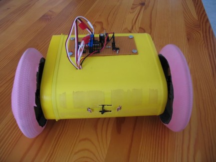 This is my first robot. It was built by the instructions found in this page: http://www.societyofrobots.com/step_by_step_robot.shtml. I used whatever I could find. The body is a nesquick box. I made the wheels from CDs, with some expanding polyurethane foam and rubber gloves for good traction. The gloves happened to be pink, hence the name. The motors are servos modified to rate continously. The contoller is an ATMega8. I choose the big wheels for the speed. The controller can be powered from the AA batteries or from a separate 9V battery (selectable by a jumper).