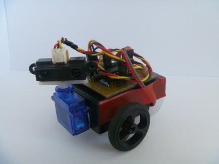 This is second version of my robot Primo. It is Lighter, Faster, Smaller and nicer (I think :D ). It is controlled by Picaxe-08M. I used one IR sensor connected on pin 4 (ADC), two geared motors connected on pins 0 and 1, and finaly one servo connected on pin 2. On pin 3 I want connected bumper, but the motors do not go backwards :( . H-bridge is L293D. I am going to build next Primo with three servos, bumper, and ultrasonic sensor.
