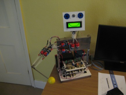 Up until now i have only built mobile robots, a few of which are posted on this site. I started reading up on AI and wanted to try and explore some ideas myself. I decided that mobile robots did not provide the type of test platform i required and so decided to start work on a robot arm. I wanted to use the human body and brain as the starting point of my research and so decided to build a robot arm that mimics the actuation and sensing capabilities of the human arm. So i give you Project ELROY! This is going to be a long term project, and a tough challenge. Up to now i have constructed a robot arm with a shoulder joint and an elbow joint, the elbow being the only one that is driven at the moment. I am using dc motors to drive the arm, but using a technique i haven't seen used anywhere else on a robot arm, some one please correct me if im wrong!! I am using the motor to turn loops of string between the motor output shaft and the robot arm, the theory being that as the string is wound up the length of it gets shorter. So far this technique seems to be quite strong and fairly controllable, with the added function of the arm joint being able to 'limp' when the string is loose, a biologically lifelike characteristic that is uncommon in many other actuators. I am using a stretch sensor from Merlin robotics as a position sensor for the robot arm, here is a link to their website http://www.merlinrobotics.co.uk/merlinrobotics/merlin-stretch-sensor-p-72.html