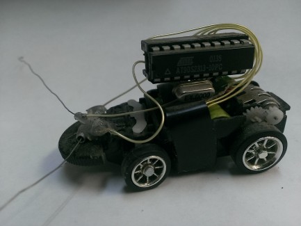 These little guys predate the Arduino era. Atmel was the new kid on the block when these were made. Check out those stylish external crystals that were necessary on those early AVR's. ;) IR diodes and transistors on the red one. Sunlight completely washed out the IR signal, so that approach was abandoned. The whisker switches on the other worked fairly well. My first attempt at biomimicry. They had no real behaviors to speak of other than to bump into something, stop, reverse, turn the wheels and go again.