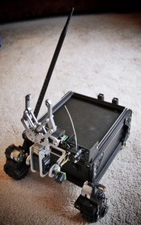 The brains of the unit are an Arduino. In both of these revisions the Arduino was a Deumillaneuve and servo control was provided by a DFRobot shield with servo breakouts and and XBee socket. Both revisions were controlled by a hacked wireless GameCube controller. Towards the end of the second revision I added an Roving. Networks (now microchip) WiFly RN-XV XBee compatible wifi module. You can see both revisions in the attached youtube videos.