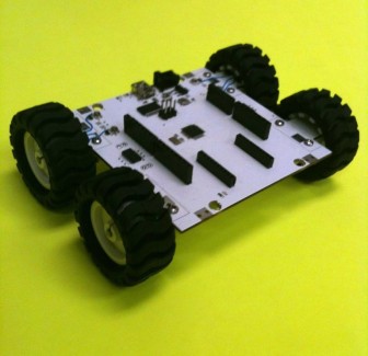 This robot features the Arduino bootloader with ATmega168 microcontroller and motor control circuitry built-in.