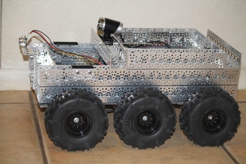 This is a 6 Wheeled Drive Robot Rover it is 18" Long 9" wide 15" wide if you count the wheels And 8" High it is powered by a Raspberry Pi with 3 L298N Motor Drivers and a Adafruit servo Hat . It is Controlled with a wireless keyboard or autonomous with a HC-SR04 ultrasonic Distance sensor or a light Follower sensor module. it has a web cam with streaming video and motion detection via CpenCV.It also has numerous sensors including A ADS1115 analog to digital converter, MPU-6050 accelerometer, HMC5883L digital Compass. DHT-11 digital temperature and humidity sensor and a BMP280 barometric pressure and altitude sensor. I'm in the Process of building a custom pan tilt unit with High torque servos that ca
