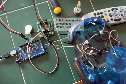 But i have hit a strange problem allready ......... First i wanted to see if the connectors for the batteries worked so i connected the 6v batterie connectors form the robot to my motor board ....which had two motors connected. I then hooked motor board up to the Arduino .. then ran a motor program to run motors one way ..... then stop them ...... and then run them the other way and then to continue in a loop. All went well motors ran and if i turned the switch on the robot to off motors stopped.