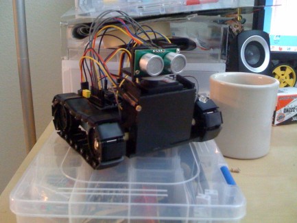 Hooking up the SRF05 turned out to be easier than I expected and the servo was easy of course. At this stage he just kind of pokes around on the floor, avoiding obstacles and deciding where to go. Nothing very exciting but at least there's some level of autonomy now, and the SRF05 works a million times better than the Sharp ever did.