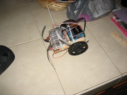 The body is a small hunk of plywood with holes drilled in it to pass the zip ties through which hold the motors gearboxes in place. The front skids are two strands of transformer wire salvaged from a TV degausing ring. They were bent in half and twisted together twice to give them some rigidity.