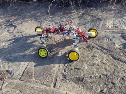 Video showing the rover doing it's self leveling thing. Arduino Uno and a couple of inclinometer sensors take care of the the leveling while I use radio control to steer and propel the rover. Not a great turner but mostly I was interested in the self leveling feature. Someone had mentioned in a comment that the steering could be implemented by using a joint in the middle of the chassis. Good idea. But this project is long gone and have used all the parts in succeeding projects. Wish it was still around to tinker with.