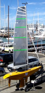 Spin is a modified 2.4mR single-person keel boat. She has 4 onboard Parallax Propeller processors for motor control and system monitoring, 64 channels of A/D, 8 gear motors for winch control, a bunch of linear actuators, and lots of other cool stuff. I hope to finish up her wiring, waterproof her, and have her sailing around Auckland by March '09. She has a carrying trolley with twin 24V, 60A gear motors for getting her up and down gangways for launching.