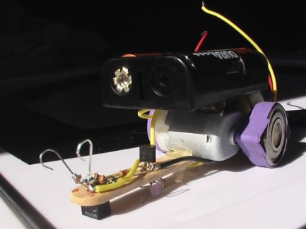 Jameco only had 16 of the motors I wanted; the rest were on back order until October. That was going to be too later for MakerFaire and another event I need to prep for. So I tested the motors on the LDR version of the SpurtBot described at the top of this article. I left the TIP120 in place, but swapped out the LDR for another QRD-1114. I also eliminated the 10k pull-down resistor and the 1.2k base resistor. The circuit worked fine!