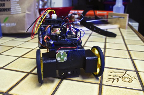 Slightly modified "Start Here" bot. Non-cosmetic differences include laser pointer attached near sensor, and a 2 DOF neck which gives it a rudimentary edge detection. The sweeping motion is to try and keep it from driving tangent to an obstacle or ledge and falling off that way. Works fairly well. Headlight for fun. Also, a speaker is attached and plays sounds based on the IR sensor input. The higher the sound, the closer an obstacle. You can tell which way it'll turn if you listen closely, as it always turns towards the more "clear" path when stopped - and thus turns in the direction of the lower sound. Finally, a 6V secondary power source was added.