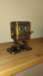 Steambob Copperpants. Another implementation of Bob the Biped. Parts printed in red and black ABS and painted with model paint. Took the arms of an old doll and screwed them on. WIP: still have to attach the record and playback module. Space is very much an issue here....... Servo's still need alignement.