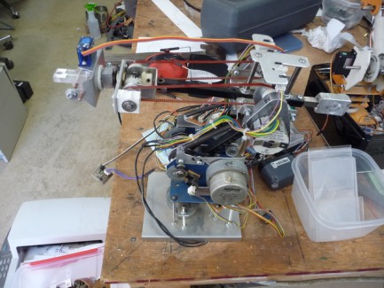 I sort of built this robot from the middle outwards. Its made from a lot of scavenged parts. Many of the parts are from industrial chart recorders, some of them are from inkjet printers, its quite a mix. In total is has 6 axies (gripper inclusive) with the gripper itself being a 9g hobby servo. Each of the stepper motors has an optical interrupter to find its zero location.
