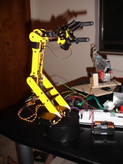 I tried coding up inverse kinematics too (determining the joint angles you need in order to put the gripper in a certain position), and just like I'd read, it seems to be too heavy to be done on a microcontroller. I got something that sort of worked, but it took several minutes to move the arm to a point just a few inches away. I'm going to keep experimenting with it, but I've pretty much accepted that eventually I'll have to hook this up to a little Linux machine or something. I imagine eventually I'll mount it on a mobile robot so it can drive around and do interesting things, and I figure that robot will be controlled by some sort of onboard nano-ITX computer or something.