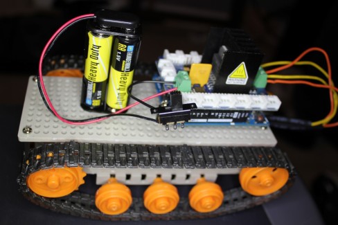 Uses a Tamiya chassis with Tamiya universal plates and a twin gearbox for forward, reverse and turning. Arduino Uno R3 with a Seedstudio motor shield v1.2. Power is controlled through an on-off switch from a 4 AA battery pack at 6V.