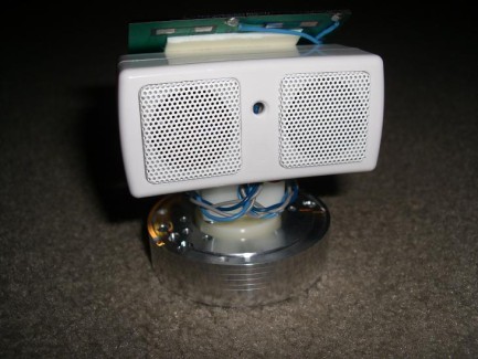 The main housing is from a speaker set designed to plug directly into a small MP3 player. The base is a machined aluminium tape head from an old-school VHS player.