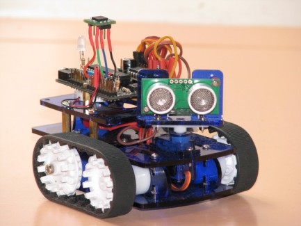 Here's a little robot built on CTC's excellent Tiny Tank chassis. It's based on a Picaxe 28X2 which handles the navigation side of things and will be joined by a 14M2 to do other things in due course. Pololu motors driven by a L293D are the motion side of things, and a servo and SRF05 do the sensing.