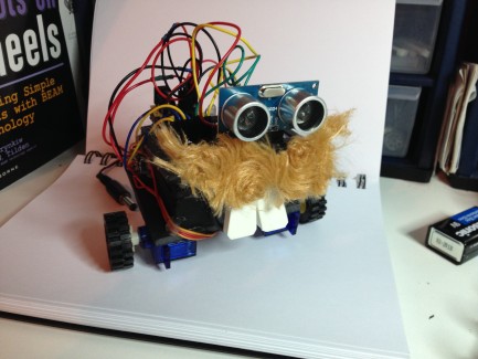 I used some Lego wheels that I glued directly to some nice servos I had. Connecting wheels to motors seems to be the weak point of most of my constructions, so far. When I first fired it up, I noticed that he did not drive straight. He's always leaning a little bit. In my code, I had him readjust every once in a while by taking a quick turn or spin in the opposite direction. It ended up giving him a bit of a twitchy strut that I find endearing. These things are what I enjoy most in building robots, I think. The emergent personality that comes out of mistakes and improvisation.
