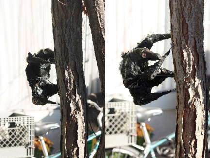 In order to instal him, we mounted 4 eyelts in the tree, bent the wires protruding from his limbs around them, and clipped off the excess. The microswitch was screwed down to the fence such that the metal lever protruded, and sqeezed the switch closed when the gate was shut all the way.