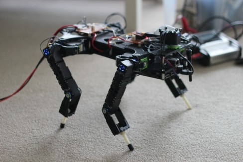 The quad in my last post was Stag Mark 1, Mark 2 is almost twice the size of its predecessor and now 100% more autonomous. Mark 2 uses a combination of HerkuleX DRS-0101 and DRS-0102 servos from Dongbu Robot to get around and it can now see with an ASUS Xtion PRO LIVE camera. The controller is still a PandaBoard ES running Ubuntu Server 12.04 and the body was printed on a RepRap Mendel.