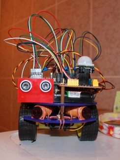 Hello everybody! Here is my first robot. It is so sweet:) I love it! :) At the moment it is not autonomous, but in the future it should be. It was not so easy to fit all the components into this little chassis, that’s why there are so many cables and wires. Actually in my plans was to attach ipcam on it, but now there are no place for the cam. Maybe I will build one floor more, or some how else fit the cam on it. Like you saw on the video I`am controlling the robot via Xbee, but in the future I will control it thru the internet(ethernet shield). Adaptive mapping is all so very interesting..:) So the hardware is done and now is start for software:) More pictures you can see here: http://www.instantgallery.de/i/mtik3j/20046216