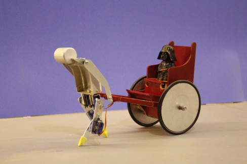I found that by placing a platform on the wheels it could carry the battery and the electronic hardware. That meant that servos used to move the legs could be small and cheap. Another thing was that the platform could be constructed in such a way that it became amusing. Such as a gurney, a dolly or wheelbarrow. You can see them in my previous post as attachments.