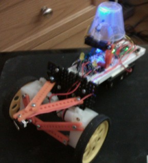 This robot abandons the previous (all very similar designs) robots I have and tries something different, and it works well!!! The motivating influence is a ZBasic ZX24su running compiled, multitasking Basic. It is quite a change from the C/C++ used with the Arduino and a nice change of pace. (Please. I know some of you hate Basic, but I grew up on it, and for me it is like an old, comfortable set of shoes.) The two front wheels are actually gears with clear (oxygen machine) tubing epoxied to them. Works great! This bot has a unique "fish tail" motion when it turns that really attracts attention. And it still manages to turn nicely. I have plastic "junk parts" laying around and a bunch of them went into the structure of this bot. Waste not, want not! Five AA rechargeable cells hung underneath the robot provide nice long run times with the low power the processor and the L293 motor controller use. Forward, reverse, speed its all there. I uses switches on both main power and the motors so I can work with the bot with the motors disabled.