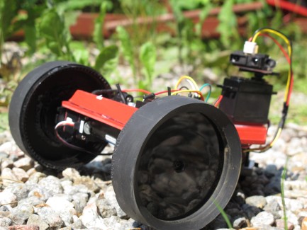 I first started building a Lego car with 1 continuous rotation servo for propulsion and one normal servo for steering and only a button for letting it know when it bumped in to stuff, the car was very slow and difficult to control and needed a lot of space for its huge turning circle so i decided to scrap it.