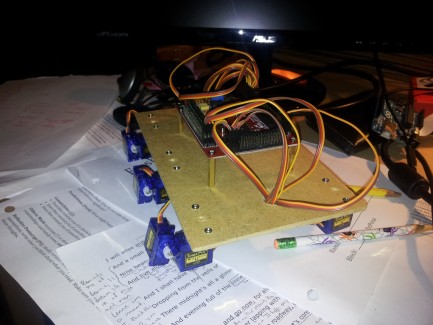 Used a piece of wood as a base, about 8x4 inches I believe. You can see by the lack of straight cuts my wonderful craftsmanship. The 6 servo horns were mounted with the included screws.